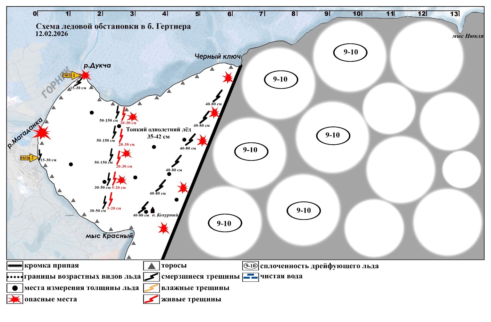 ЛЕДОВАЯ ОБСТАНОВКА В БУХТЕ ГЕРТНЕРА НА 12 ФЕВРАЛЯ 2026 ГОДА.