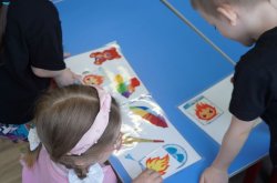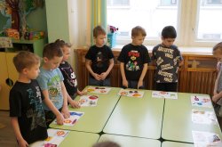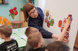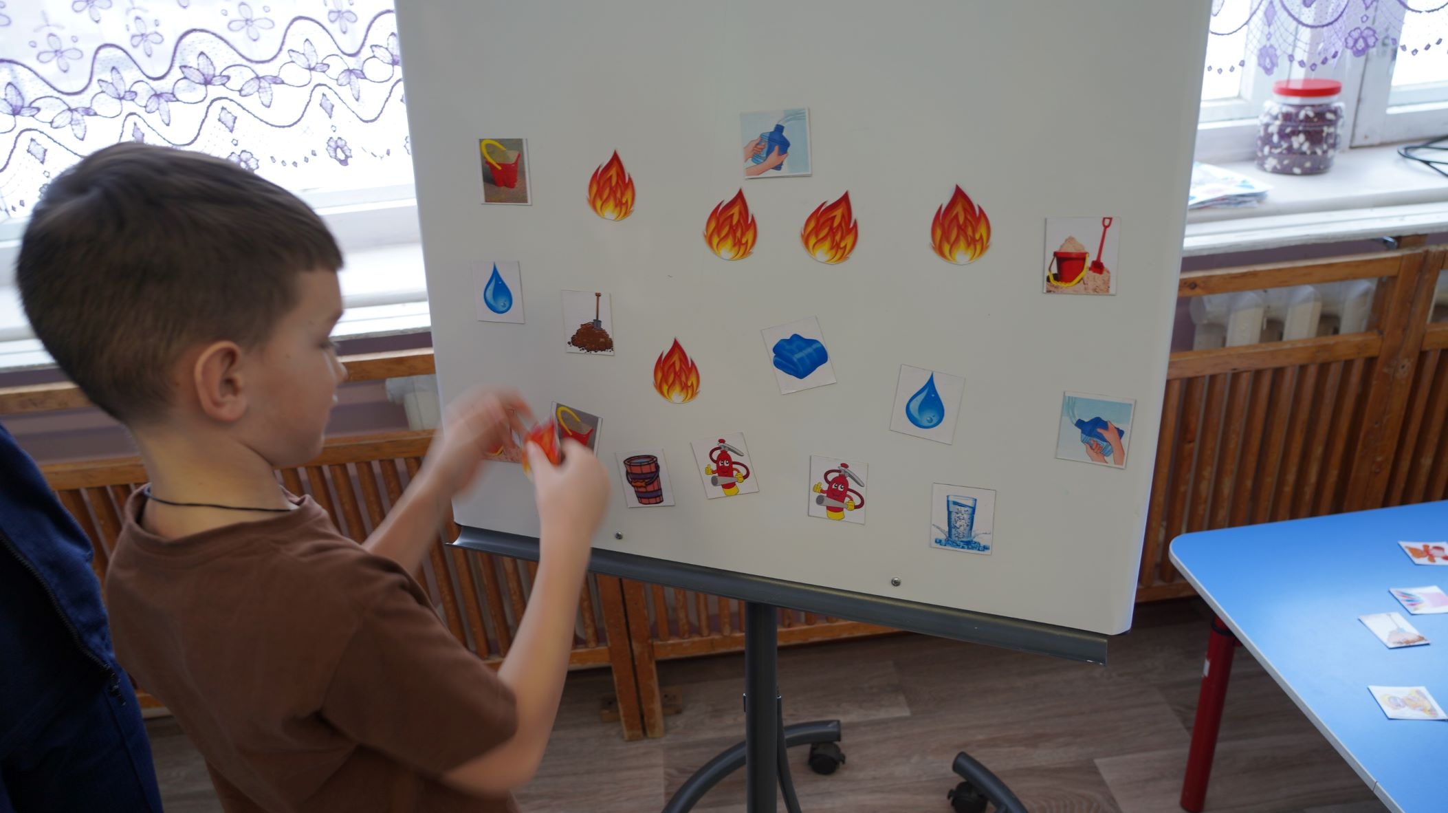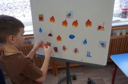 Второе задание – «Тушение огня». На магнитной доске были представлены силуэты огня и картинки с изображением различных предметов, а среди них те, которыми можно погасить огнем. Задача воспитанников – выбрать правильную картинку и закрыть ею огонек.