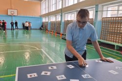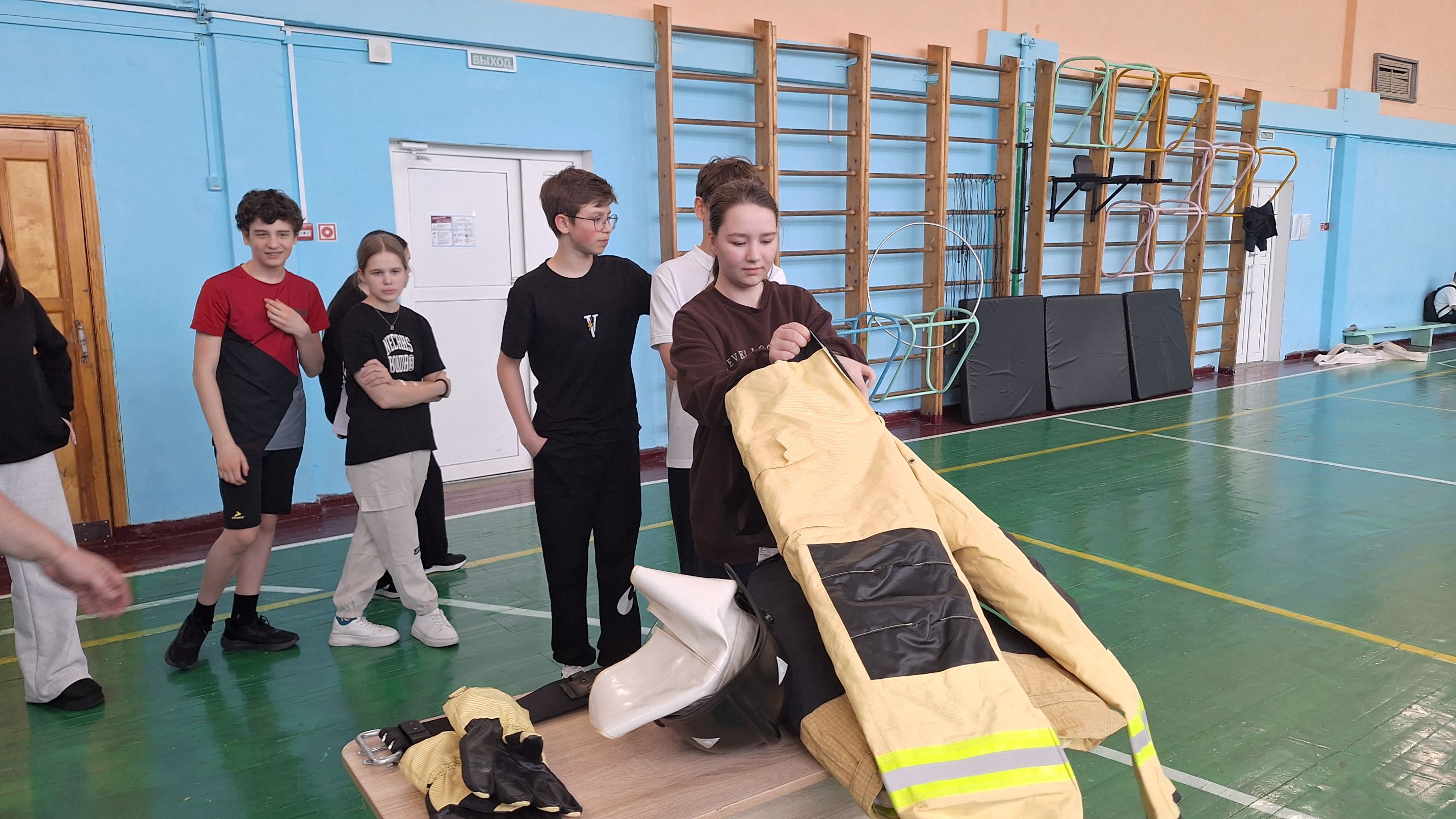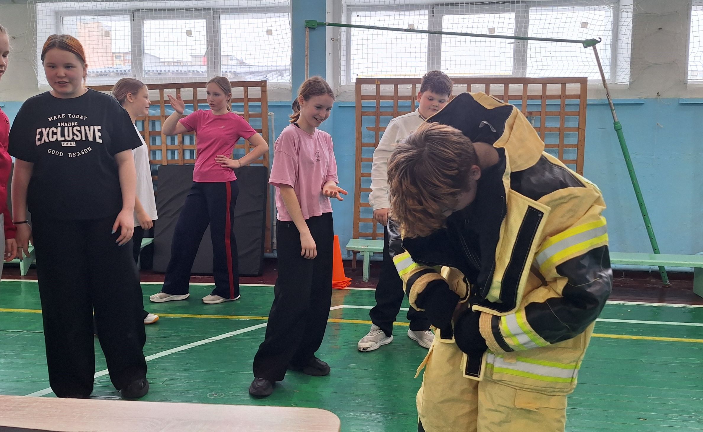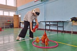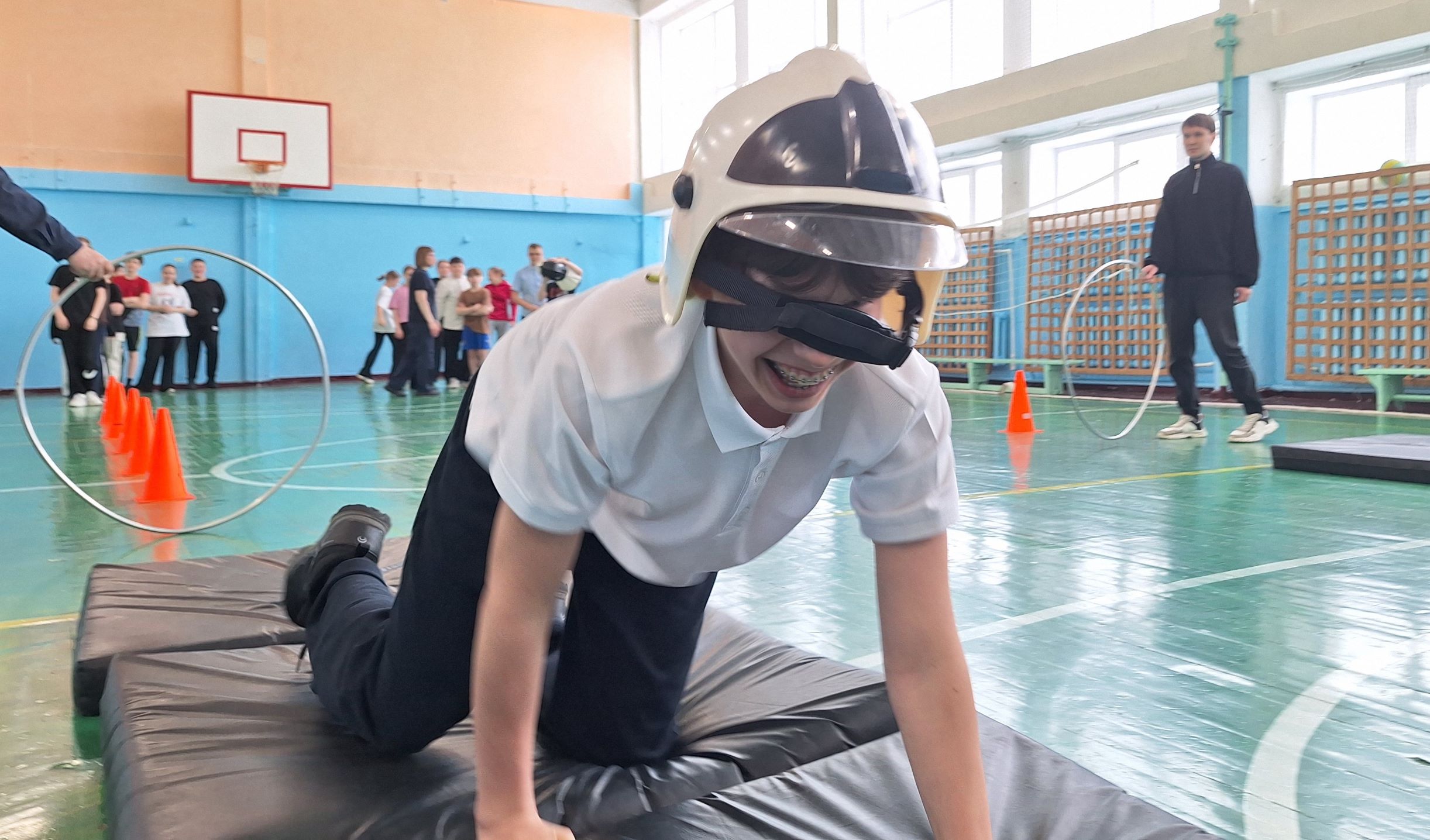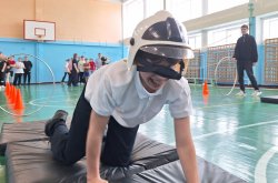 Следующий этап представлял собой полосу препятствий, состоящую из конусов, обручей и матов, а также условного пожара, который ребята тушили с помощью огнетушителя. Всю дистанцию школьники проходили в касках пожарных.