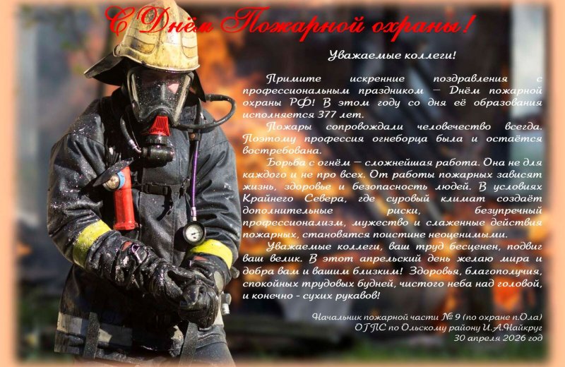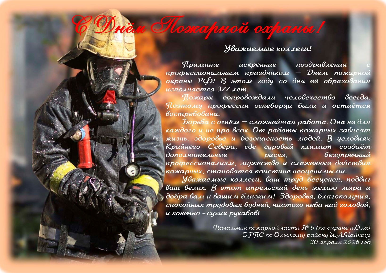 НАЧАЛЬНИК ОГПС ПО ОЛЬСКОМУ РАЙОНУ ИЛЬЯ НАЙКРУГ ПОЗДРАВЛЯЕТ ПОЖАРНЫХ С ПРОФЕССИОНАЛЬНЫМ ПРАЗДНИКОМ